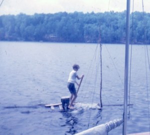Catamaran design came naturally to Ted. Two saturated logs found on shore, some salvaged boards for a bridgedeck, a shower curtain for propulsion and a wooden crate for a seat, solved a lot of the initial stability issues when designing his first vessel at his childhood cottage.